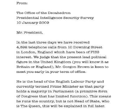 Not too long ago there was a commotion about sensitive government information being leaked to newspapers and radical blogs for publication. Much of this embarrassed the U.S. Government. The following was purported to be written to then president-elect Barrack Obama, 10 days before he was sworn in as President, briefing him on certain aspects of U.S. - UK relations. This confidential briefing summary to Obama is apparently from PISS. I can't/won't tell you where I got it, but I will leave its validity to your judgement. Seems pretty authentic to me, based on spelling mistakes.
